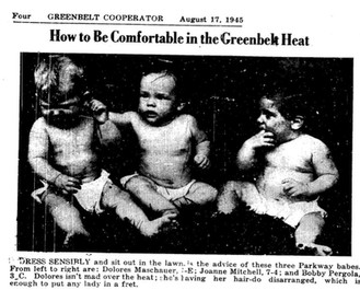 During the WWII years, the town expanded with the new defense housing, and women were busy helping with the war effort. “Baby playgrounds” were organized with specially trained high school girls leading children’s activities during the day. The culmination of that program at summer’s end was a talent show for the adults. These shows were filled with dancing and tumbling. There was the ever popular baseball in Greenbelt, swimming lessons, tennis lessons, and when it was just too hot, a day at the movies. Movie advertisements in the newspaper boldly highlighted the air conditioning in the theater, a huge draw. Greenbelt children in need of pocket money for the movies could participate in the City run program that paid youths 25¢ for each pint of Japanese Beetles they captured and turned in. This was an increase from the traditional 25¢ per quart from earlier years!